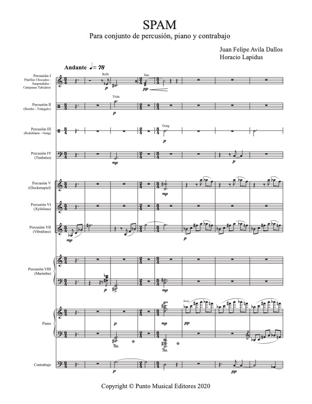 Para conjunto de percusión, piano y contrabajo Juan Felipe AvilaHoracio LapidusContiene: ScoreFormato digital: ISMN 979-0-801626-45-5Precio de venta: 40.000 COP Share this: Share on X (Opens in new window) X Share on Facebook (Opens in new window) Facebook Like Loading...
